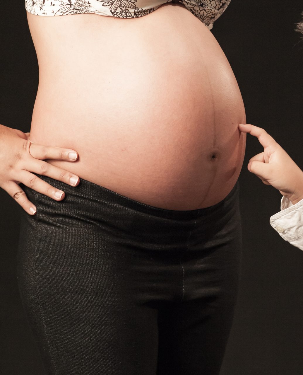 boy finger touch mom pregnant stomach with care on black background